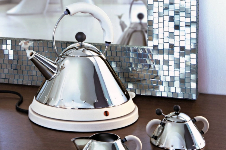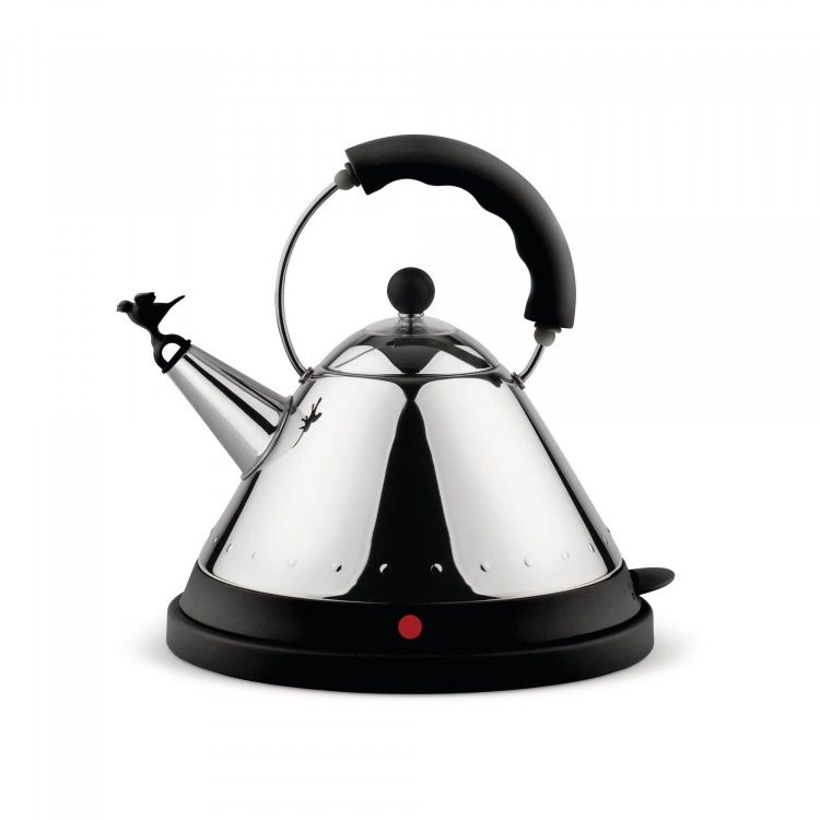 I Michael Graves formspråk kombineras influenser från europeisk och precolumbiansk kultur med visuella influenser från Art Deco och Pop Art. Graves är en välrenommerad designer och har formgivit flertal klassiska produkter för Alessi. MG32 är den eldrivna versionen av ikoniska kitteln 9093, med visslande pip i form av en fågel. Originalet formgavs av Michael Graves år 1985 för Alessi.