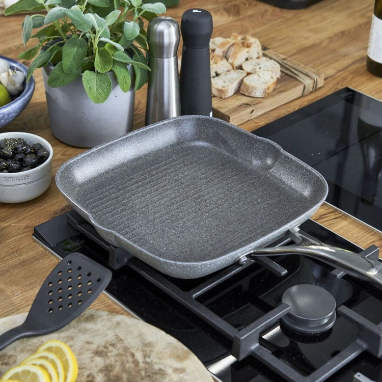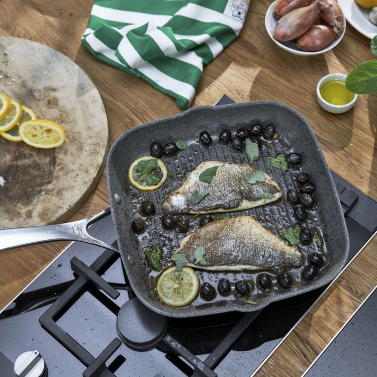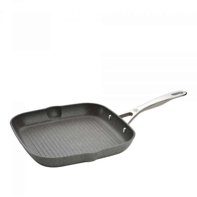 Salina Grillpanna – 28×28 cm är en grillpanna med räfflad botten från italienska varumärket Ballarini. En bra grillpanna när du önskar en frasigare yta på grönsakerna, fisken eller köttet. Grillpannan kommer från serien Salina Granitium och är en serie av flera stek- och kokkärl som är tåliga och slitstarka. Salina Grillpanna – 28×28 cm har en extra tålig beläggning som är väldigt motståndskraftig mot repor och därmed väldigt optimal för vardaglig användning. Beläggningen fungerar som ett starkt skydd mot de andra sex underliggande lagren som pannan består av. Salina Grillpanna – 28×28 cm är gjord för snabb värmespridning och fungerar på alla typer av hällar. Man kan även använda den på induktionshällar, då den har en Radiant-botten som är speciellt anpassad för det.