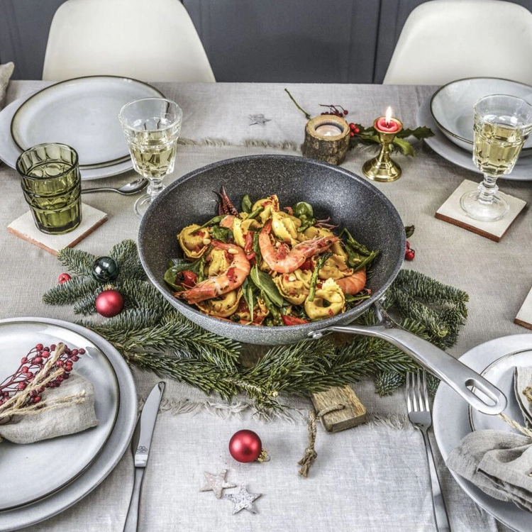 Salina Wok – Ø 30 cm är en wokpanna med höga kanter från italienska varumärket Ballarini. Denna wokpanna är perfekt för tillagning av asiatiska maträtter med sin non-stick beläggning som gör att maten inte fastnar. Salina Wok – Ø 30 cm har ett rostfritt och ergonomiskt handtag för bekvämlighet med en Stay Cool-effekt vilket gör att du inte bränner händerna. Wokpannan är speciellt anpassad för induktionshällar med sin Radiant-botten men fungerar även bra på andra typer av hällar. Salina Wok – Ø 30 cm kommer från serien Salina Granitium och är en serie av flera stek- och kokkärl som är tåliga och motståndskraftiga. Pannan tål metallredskap utan vassa kanter vilket gör beläggningen till en av de mest tåliga.