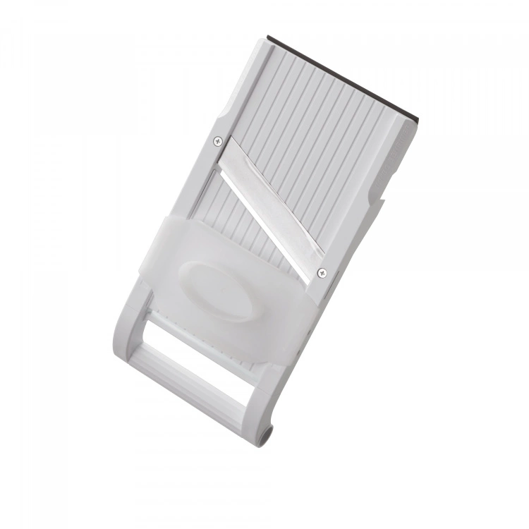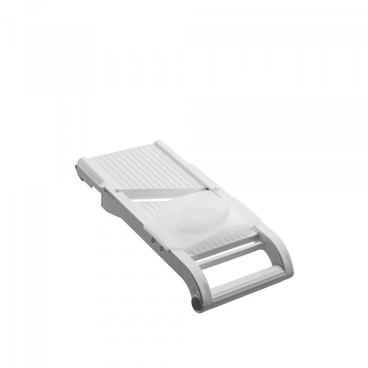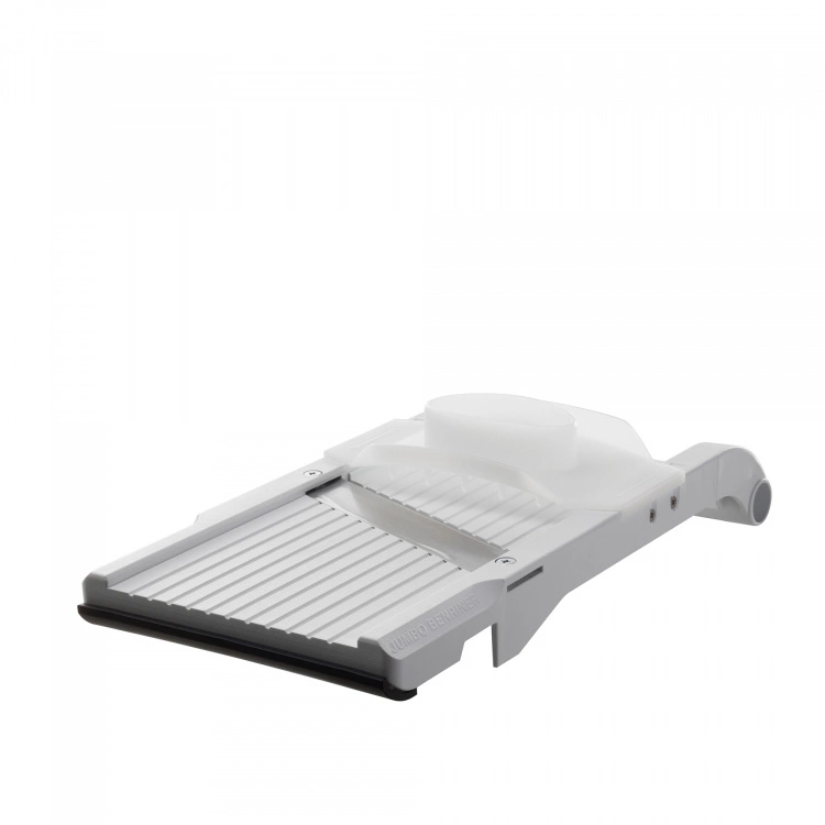 Mandolin Jumbo 12 cm – Vit är en klassisk mandolin av högsta kvalitet från det japanska varumärket Benriner. Mandolinen är tillverkad i livsmedelgodkänt BPA-fri plast med ett 12 cm långt handslipat knivblad i rostfritt stål. Det knivvassa bladet har en steglös inställning från 0,5 mm till 5 mm som du enkelt kan justera till den exakta tjockleken du önskar för varje skiva.