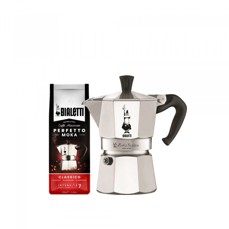 Moka Express & Coffee Set är ett set med Mokabryggare och malet kaffe från det italienska varumärket Bialetti. Setet kommer i en presentförpackning och innehåller Mokabryggaren Moka Express (3 kopp, 200 ml) samt 200 gr klassiskt malet moka-kaffe.
