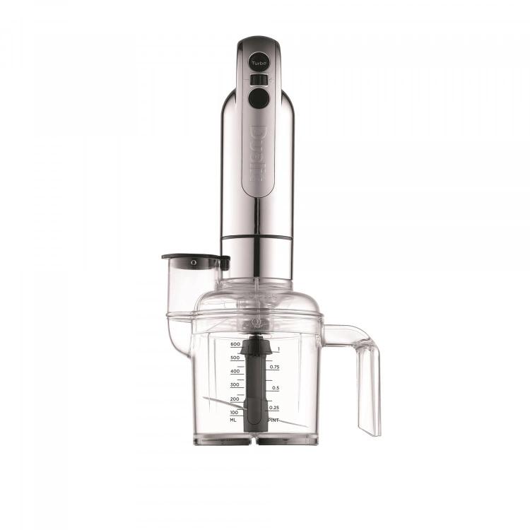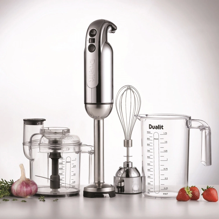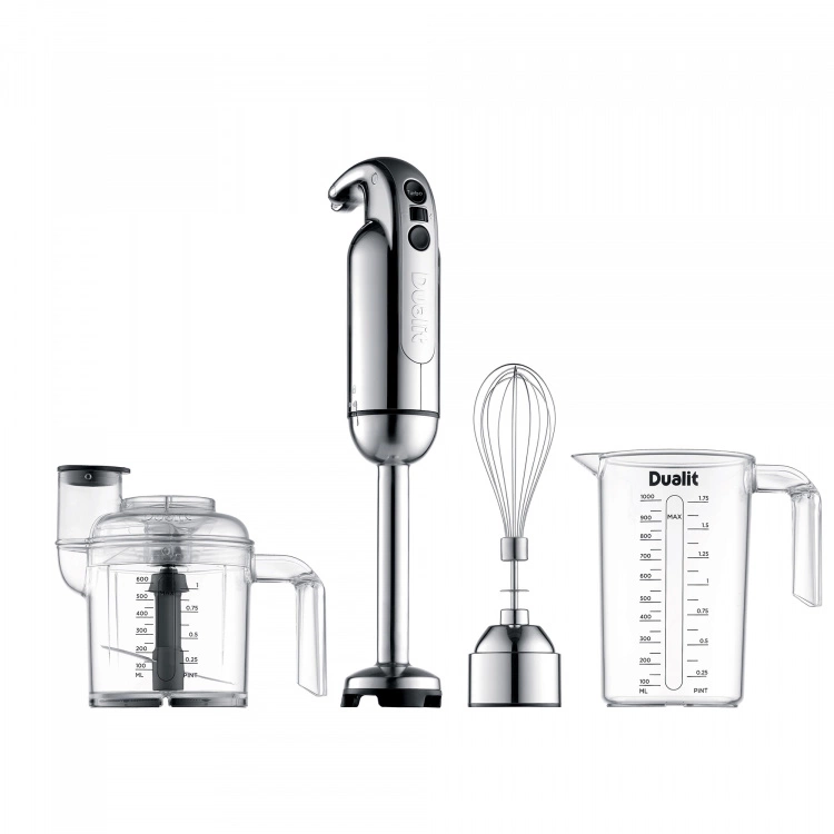 Från varumärket Dualit kommer Dualit Stavmixer Med Tillbehör. Med detta stavmixerkit klarar du enkelt av de allra flesta mindre uppgifter i köket. Du kan mixa, vispa och hacka. Alla delar går praktiskt att förvara utan att de tar för mycket plats. Dualit Stavmixer Med Tillbehör har en motor på 700W vilket gör den mycket effektiv. Dualit Stavmixer Med Tillbehör har en elegant design med kromad finish och ett ergonomiskt handtag.
