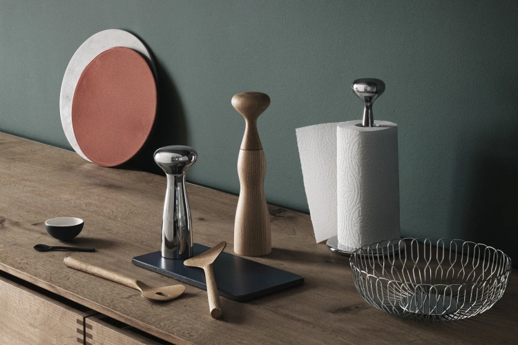 Kollektionen har ett skulpturalt formspråk och är skapad av material som kompletterar varandra, såsom stål och ek. Produkterna i serien kan med fördel kombineras och hushållspappershållaren passar till exempel bra med salt- och pepparkvarnarna samt brödkorgen.