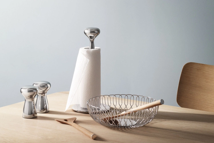 Hushållspappershållaren från Georg Jensens Alfredo Collection är designad av Alfredo Häberli. Den är tillverkad av högglanspolerat rostfritt stål och har elegant formspråk, med en rundad topp som matchar designen för de andra produkterna i Alfredo Collection från Georg Jensen.