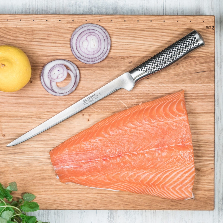 Global G-30 Filékniv Flexibel 21 cm från varumärket Global. Filékniven är en följsam och flexibel kniv med ett långsmalt blad – perfekt för att filea fisk. På så sätt kan du på ett enkelt och varsamt sätt skära under skinnet och benen på fisken. Filékniven lämpar sig även väl för att putsa kött och fågel. Global G-30 Filékniv Flexibel 21 cm är tillverkad av högkvalitativ rostfritt stål med en konstruktion som gör den hållbar och smidig.