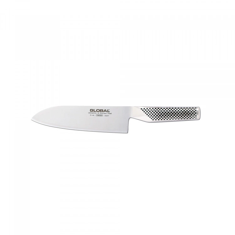 Global G-46 Santokukniv 18 cm från varumärket Global. Santoku är ett japanskt ord som betyder tre uppgifter. Därav namnet på santokukniven som är utformad för att just tärna, hacka och skära, med lätthet och precision. Bladet är tillverkat av högkvalitativt rostfritt stål och är 18 cm långt, vilket gör det till den perfekta storleken för de flesta uppgifter i köket. Santokukokniven är en japansk knivmodell som har många likheter med en klassisk kockkniv. Skillnaden är att bladet är något kortare och har en rundad spets. En mångsidig kniv med exceptionell skärpa och hållbarhet.