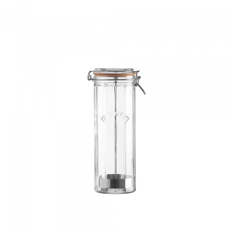 Kilner Spaghetti Jar är en specialdesignad spaghettidispenser för att hålla spagettin lufttätt. Behållaren är tillverkad av glas som är ett perfekt material för matförvaring. Varumärket har skapat en unik funktion för Kilner Spaghetti Jar. När pastan ska tas upp ur burken hjälper ”viftarna” till så ingen pasta behövs skakas ur behållaren. Sedan är det bara att enkelt låsa spagettiburken. Behållaren passar också bra för brödpinnar. Varumärkets ikoniska logga är präglad på burken framsida så Kilner Spaghetti Jar blir en snygg detalj på kökshyllan.
