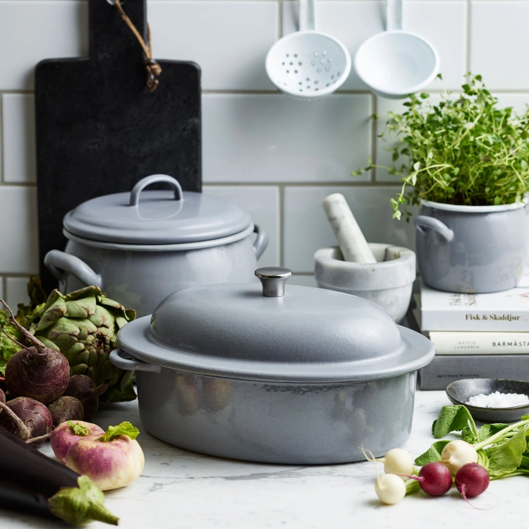 Alla Kockums emaljerade grytor har dubbla lager av emalj som står emot smuts och är enkla att rengöra. Grytan fungerar för alla typer av spisar och ugnar, även induktion och gas.