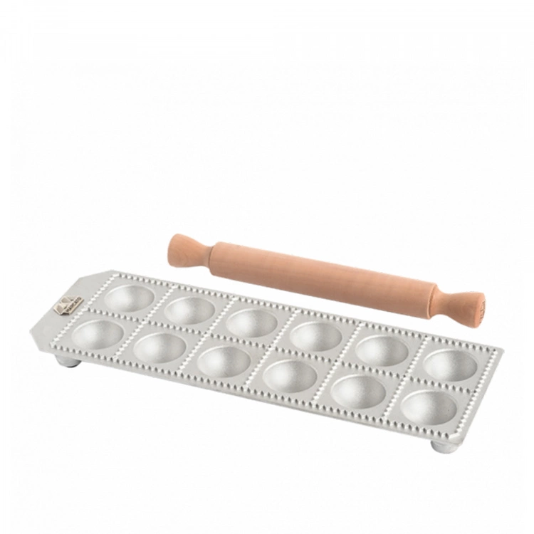 Ravioliplåt från varumärket Marcato. För att enkelt göra ravioli så har Marcato skapat denna fantastiska ravioliform. Ravioliplåten är tillverkad av pressgjuten aluminium, så den är robust och motståndskraftig för vardaglig matlagning. Tyngden ger den en stabilitet vilket underlättar när raviolin ska göras. Dessutom är den medföljande kaveln tillverkad av massivt trä, vilket gör den hållbar och kan användas pålitligt över tid. Denna form ger dig 12 runda ravioli agnolotti som du kan fylla med valfritt innehåll. Ravioliplåten rengörs enklast med en trasa.