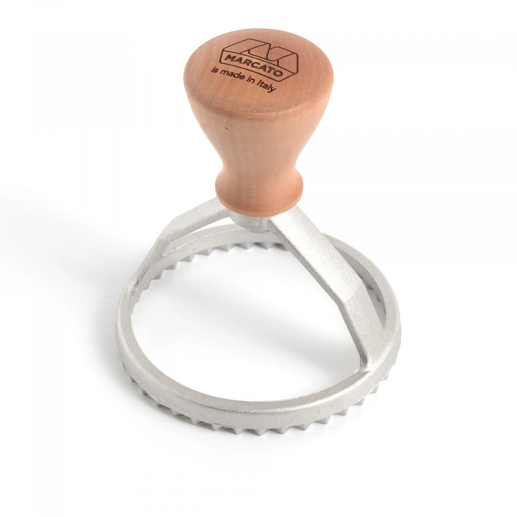 Raviolistämpel från varumärket Marcato. Marcatos pastastämplar är tillverkade av pressgjuten aluminium, ett solitt material av livsmedelskvalitet som lämnar ett rent snitt efter sig. Dessutom är handtagen tillverkade av massivt trä för hållbarhet och fantastiskt grepp. Denna stämpel gör det enkelt att skapa runda 8 cm ravioli agnolotti, men passar även utmärkt att använda till bakning eller andra smårätter som exempelvis dumplings. Raviolistämpeln rengörs enkelt med en torr trasa och bör ej diskas i diskmaskin.