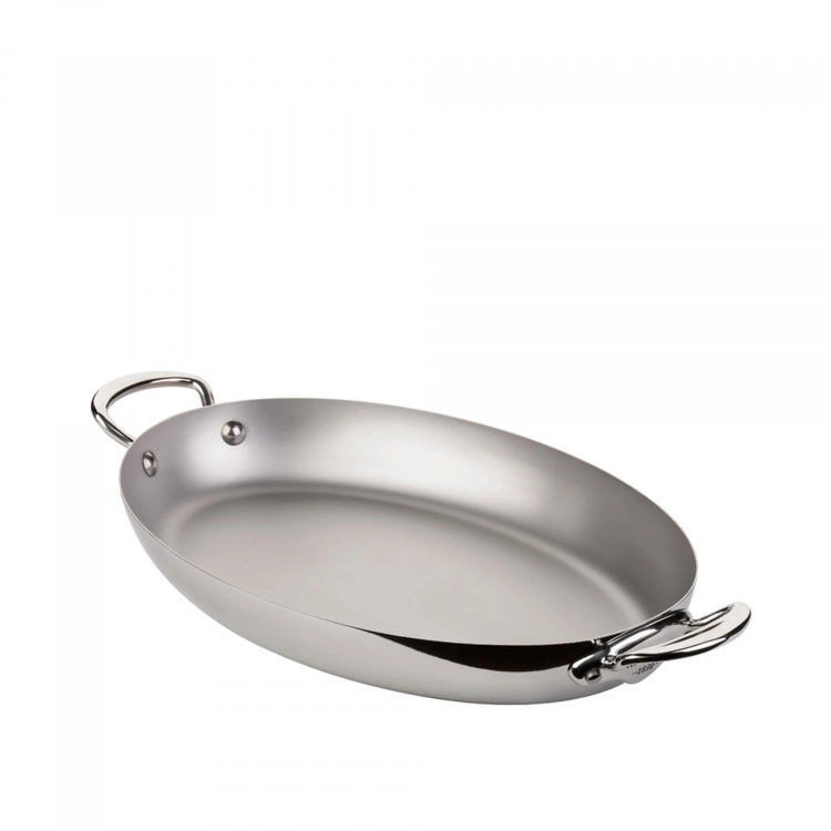 Oval Pan Cook Style Steel – 30 cm är en ugnsform från det franska varumärket Mauviel. Ugnsformens design med oval form och två handtag gör att den är perfekt för både matlagning och servering. Oval Pan Cook Style Steel från Maviel är tillverkad i rostfritt stål och har en femlagers-konstruktion som gör att formen passar till alla typer av spisar, samt att den kan användas i ugn.
