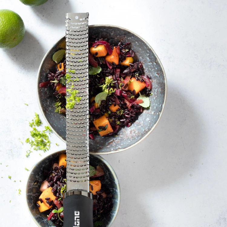Premium Classic Zester – Svart är perfekt för citrusfrukter, hårdost, choklad, ingefära, vitlök, muskotnöt, tryffel, kryddor, nötter med mera. Råvaran skärs med varsamhet och precision, utan att rivas sönder. På så sätt kan smak och arom utvecklas vilket förhöjer matlagningen, bakningen, grillningen eller garneringen. Kan diskas i diskmaskinen.