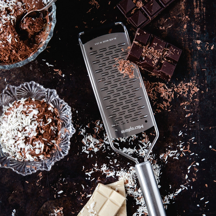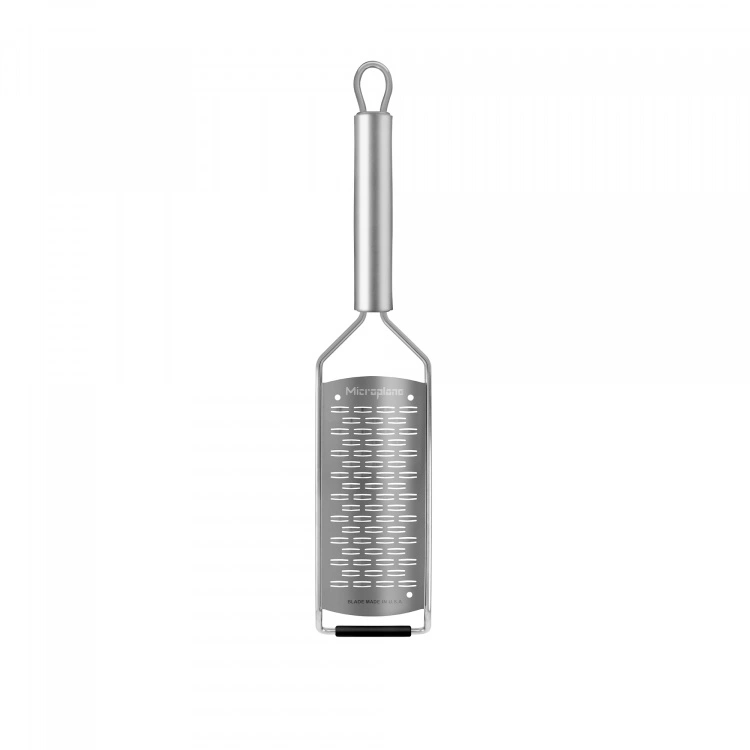 Professional Series Rivjärn Medium Ribbon från det amerikanska varumärket Microplane. Rivjärnet passar utmärkt till äpplen, potatis, morötter, vitlök, kokosnötter, choklad, lök, hårda och mjuka ostar, zucchini och mycket mer. Resultatet är ett fint och lite längre snitt på ett snabbt, exakt och varsamt sätt utan ansträngning.