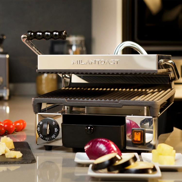 Cast Iron Contact Grill från det italienska varumärket Milantoast. Den professionella elgrillen i rostfritt stål är försedd med två räfflade non-stickplattor i gjutjärn med en speciell keramisk beläggningsyta som gör dem motståndskraftiga mot syror, salt och korrosion. Gjutjärnsplattorna kännetecknas även av sin värmehållande förmåga, vilket möjliggör snabb och jämn uppvärmning samt utmärkt värmehållning. Temperatur upp till 300° C.