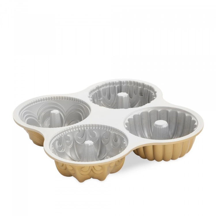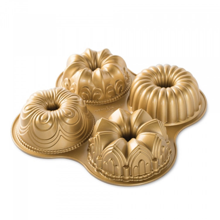 En guldfärgad bakform med fyra stycken mindre olika former i en från Nordic Ware. Med Bundt Quartet Pan slipper du bestämma dig för endast ett recept, med denna bakform kan man baka fyra olika bakelser samtidigt. Med sin effektiva non-stickbeläggningen hjälper den bakelserna att släppa bakformen och att inte gå sönder. Perfekt att ha i sitt kök när man ska baka flera kakor samtidigt. Detaljerna i formen gör det trevligare att baka och resultatet kommer uppskattas av gästerna. Bundt Quartet Pan ska handdiskas före sin första användning men även efter för bästa hållbarhet. Metallredskap ska undvikas för att inte repa på non-stickbeläggningen.