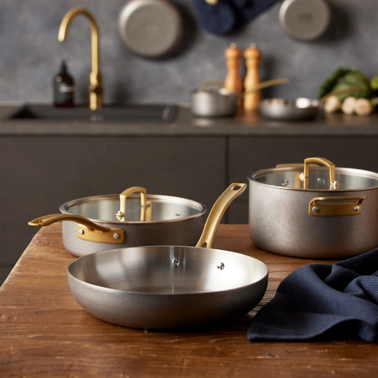 Durance Frying Pan är designad av det franska varumärket Pillivuyt. Stekpannan är tillverkad i rostfritt 18/10-stål med en 2,5 mm 3-skiktskonstruktion av aluminium och rostfritt stål. Det mellersta skiktet av aluminium ger en optimal värmefördelning. Handtagen är nitade, PVD-förgyllda och gjutna i stål. Locket är formgivet i glas med praktiska ånghål. Stekpannan har en stilren vintage-polering med funktionella måttstreck på insidan. Den passar alla värmekällor och tål maskindisk. Durance Frying Pan finns i två olika storlekar – 20 cm och 28 cm.