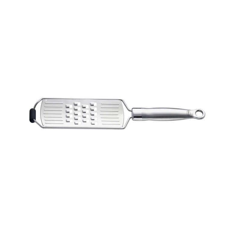 Från Rösle kommer Rivjärn Grovt. Rivjärnet är helt tillverkat av rostfritt stål och utformad med ett ergonomiskt handtag och syraetsade tänder. Den konkava formen centrerar materialet som ska rivas för snabba och effektiva resultat, medan in- och utkörningsytorna gör det enkelt att applicera materialet jämnt. Dessutom behöver du aldrig oroa dig för att hitta en yta att vila rivjärnet på, dess silikonbas ger ett stadigt, halkfritt grepp i alla lägen. Det gör den lätt att använda direkt en skål utan bekymmer. Ett skyddshölje medföljer även till Rivjärn Grovt för att skydda dina fingrar.