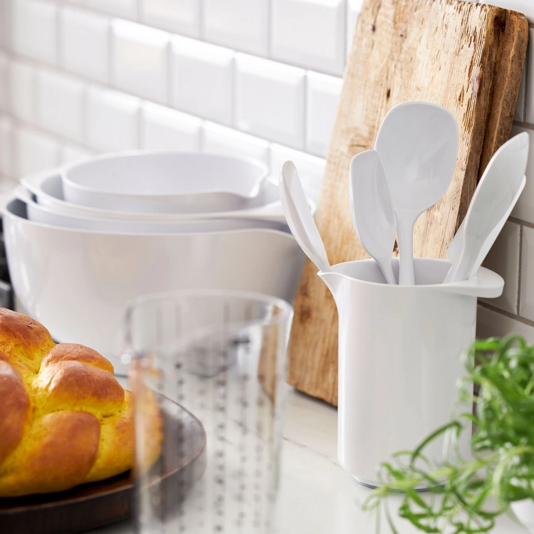 Tål maskindisk, använd helst inte redskap av metall då det kan repa kannan. Mixkannan är tillverkade av melanin som har egenskapen att den håller formen även om den blir varm.