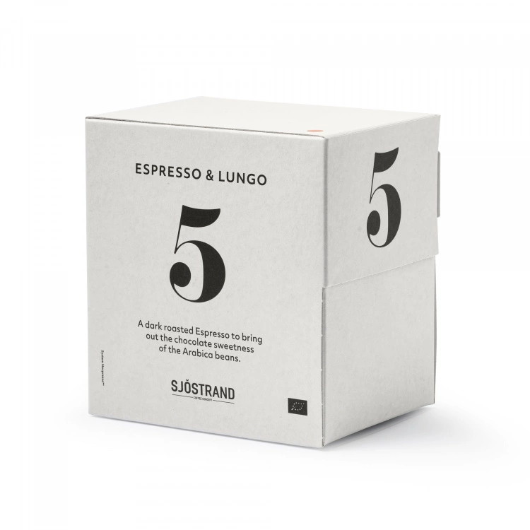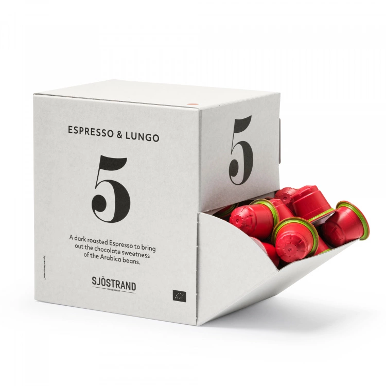 N°5 Espresso/Lungo 100-pack är kaffekapslar från varumärket Sjöstrand Coffee Concept att använda till Sjöstrand Espresso Capsule Machine. N°5 Espresso/Lungo 100-pack är en mörkrostad espresso som framhäver den eleganta chokladsötman i arabicabönan. N°5 passar lika bra som espresso såväl som lungo, bestående av en mix arabicabönor från Peru, Honduras och Mexiko. Intensitet 4/5. Storleken är 40 ml vilket motsvarar en liten kopp. Kapslarna är klimatpositiva tack vare att Sjöstrand kompenserar för mer koldioxid än vad som släpps ut från böna till kopp. Kaffet är 100% ekologiskt samt rättvisemärkt, fyllt i en komposterbar kapsel.