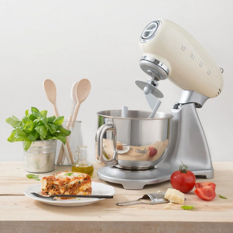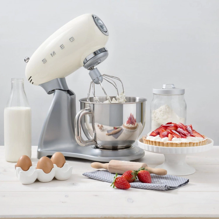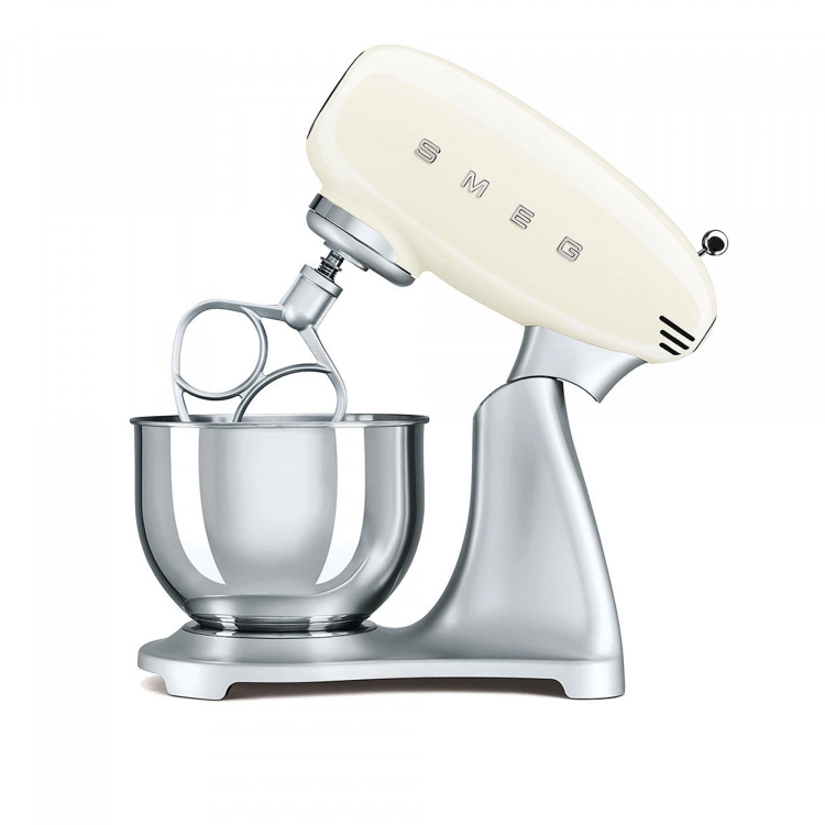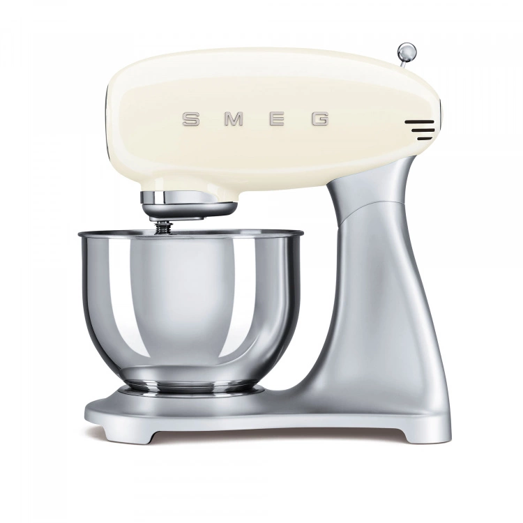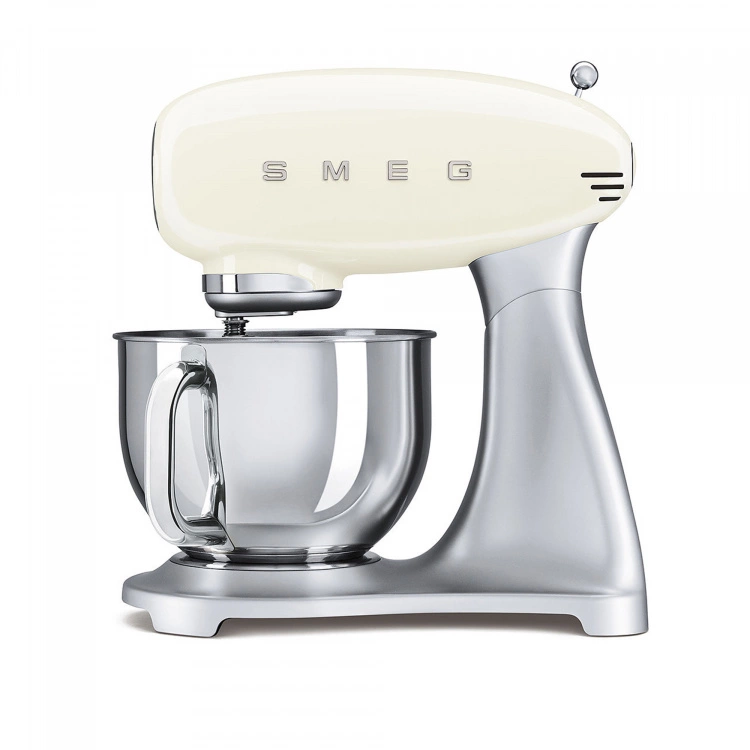 Smeg Köksmaskin Creme är en prisbelönt köksassistent som har kommit att bli en stilikon världen över. Köksmaskinen ingår i den populära retroserien med 50-talsstil från Smeg och är tillverkad i formpressad aluminium men en ergonomisk design. Den polerade bunken i rostfritt stål på 4,8 liter täcker de flesta användningsområden och är försedd med ett handtag som underlättar placering och borttagning. Smeg Köksmaskin Creme har tio hastigheter, planetär blandningsfunktion och ett säkerhetsstopp som utlöses när motorarmen lyfts eller vid överbelastning. Den har en inbyggd sladdvinda och gummitassar gör att maskinen står stadigt. Smeg Köksmaskin finns i sju olika färger.