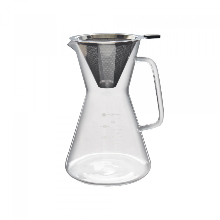 Pour-Over Coffee Maker – 8 Cups är designad av varumärket The London Sip. Den tidlösa kaffebryggaren är både stilren och funktionell. Karaffen är tillverkad i stöttåligt borosilikatglas, vilket är ett material som är särskilt bra på att tåla värme. Tack vare den eleganta pipen, de ergonomiska handtagen och måtten på karaffens sida är den enkel att använda. Med karaffen medföljer ett återanvändningsbart kaffefilter i rostfritt stål. Kaffebryggaren rymmer 1,2 liter, vilket motsvarar 8 koppar kaffe, men finns även att köpa hos oss i en mindre storlek som rymmer 600 ml, vilket motsvarar 4 koppar.